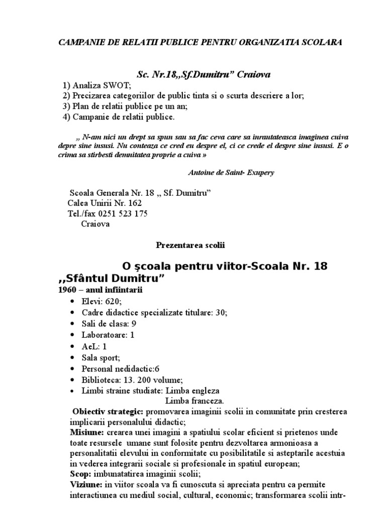 Campanie De Relatii Publice Pentru Organizatia Scolara